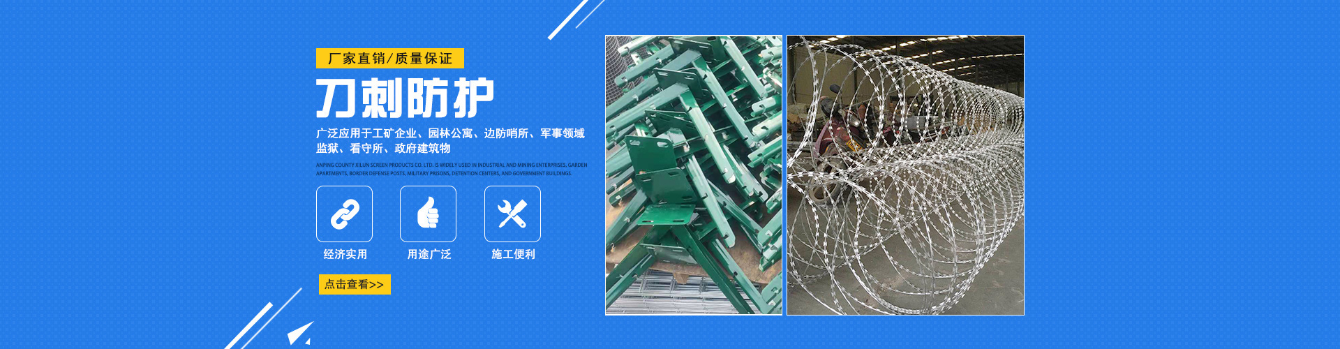 安平初日金屬絲網(wǎng)制品有限公司是一家集生產(chǎn)、深加工、銷售、安裝于一體的絲網(wǎng)生產(chǎn)企業(yè),公司主要產(chǎn)品有刀片刺繩、刺絲滾籠、刺繩支架等多種產(chǎn)品,公司設(shè)備精良,科學(xué)管理,為廣大客戶提供高質(zhì)量產(chǎn)品,深受客商的信賴與支持。
